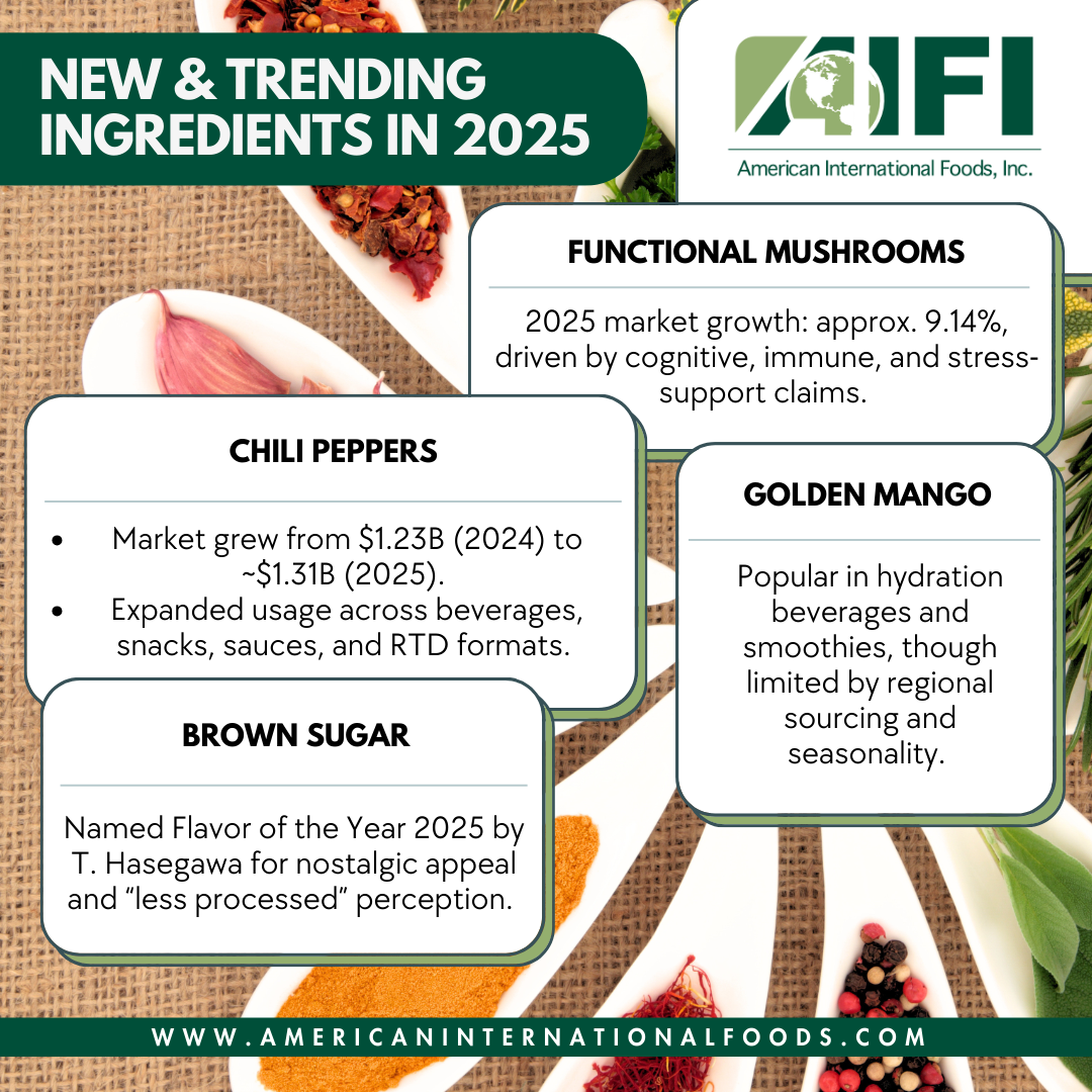 2025 was a pivotal year for ingredient development in the food and beverage industry. The trends AIFI identified early in the year, such as global flavors, plant-based evolution, and functional nutrition, continue to gain traction. At the same time, emerging ingredients such as brown sugar, functional mushrooms, and miso are reshaping flavor & formulation possibilities.